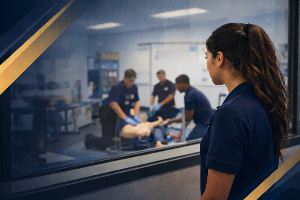 Students are trained to evaluate airway, breathing, and circulation and determine the appropriate level of care in high-pressure situations.